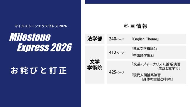 Express 【重要】価格改定のお知らせ 毎年『Milestone Express』をご愛読いただき、ありがとうございます。 誠に恐れ入りますが、印刷費・運送費の高騰により、3月上旬発売予定の『Milestone Express 2026』につきまして、価格を改定いたします。 詳細... 2026.02.01 Expressおしらせ出版物