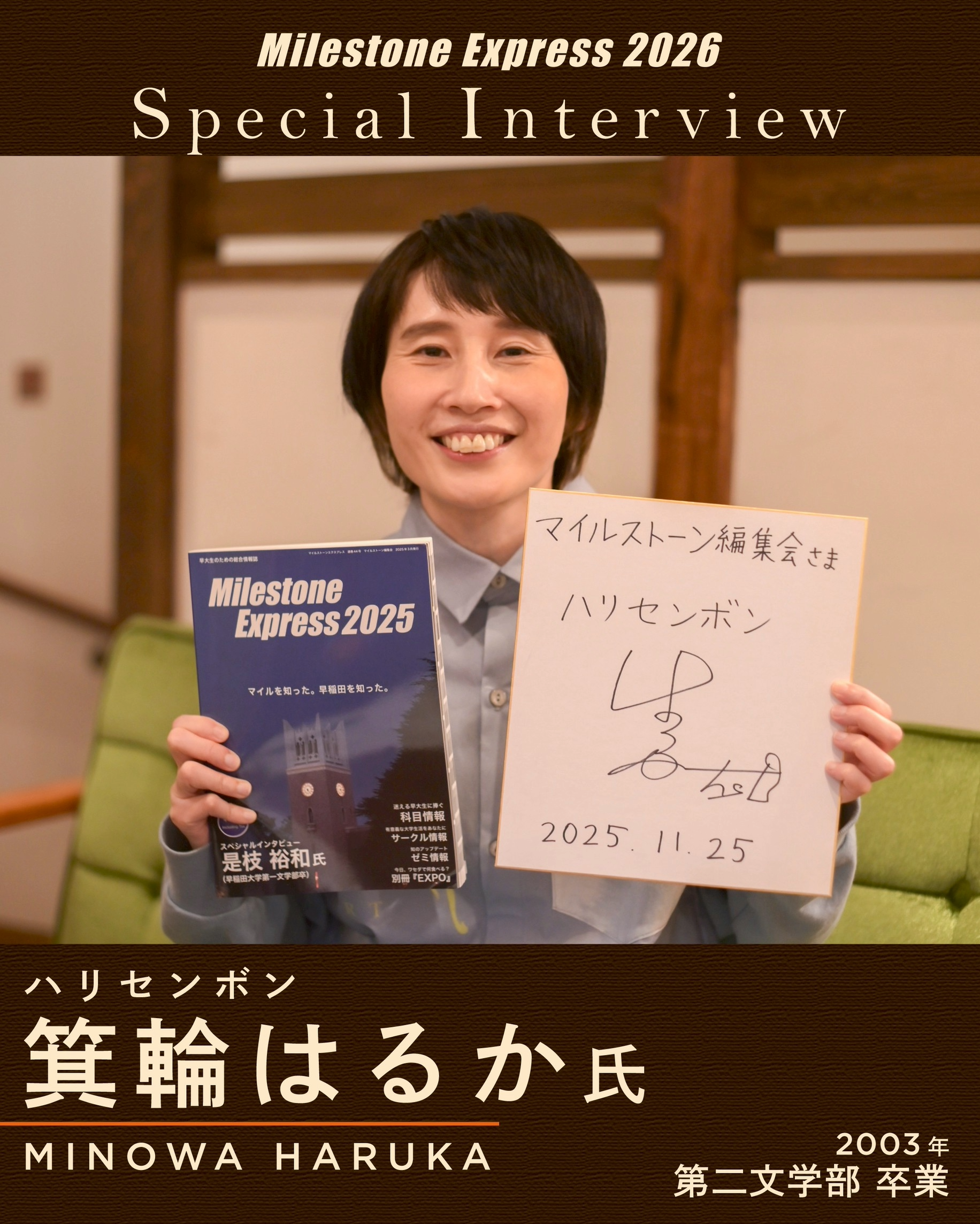 『Milestone Express 2026』スペシャルインタビューには、早稲田大学第二文学部を卒業されたハリセンボン・箕輪はるかさんが登場!