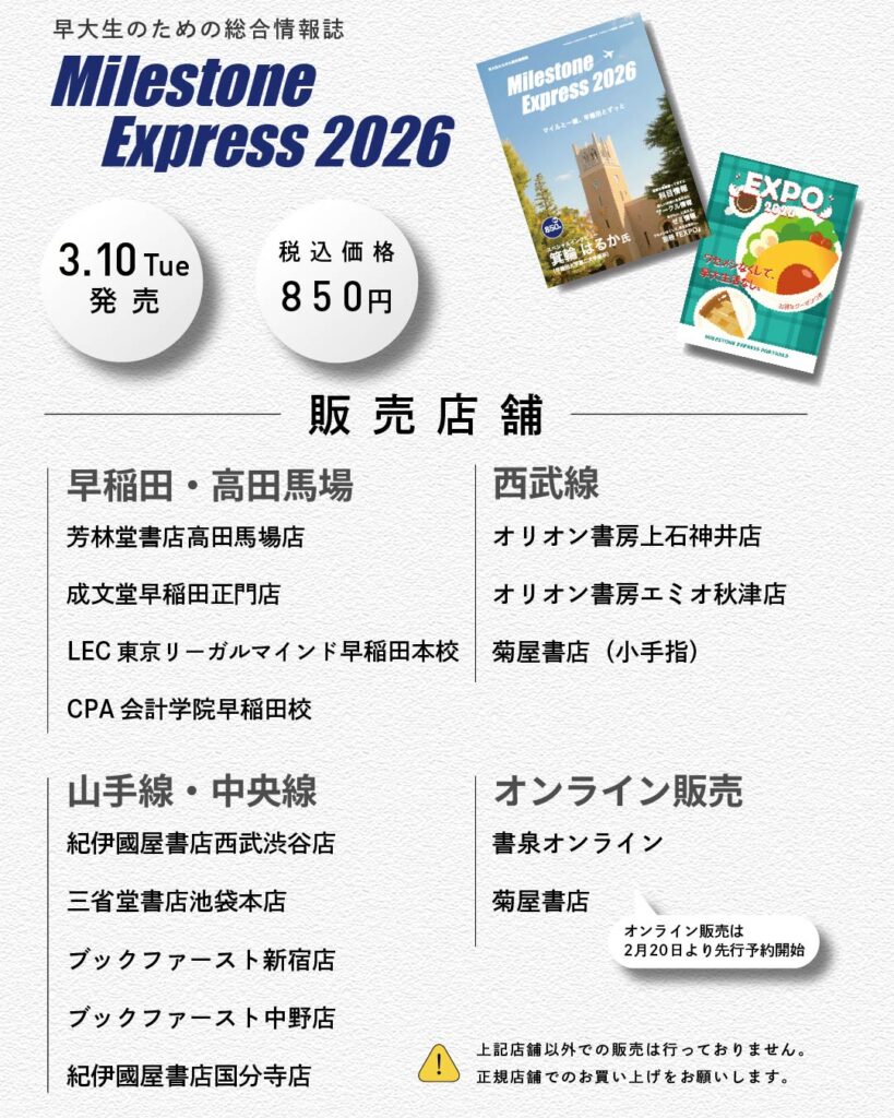 以上14店舗に『Milestone Express 2026』を取り扱っていただけることとなりました! 3月10日以降、ぜひお立ち寄りください!