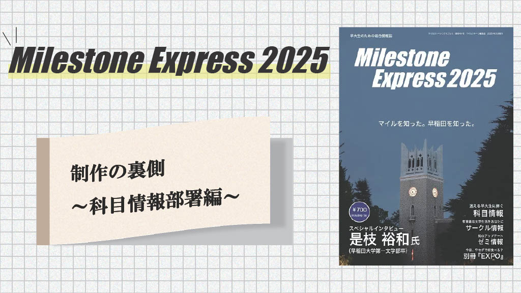 早大生の科目登録に不可欠と言っても過言ではない『Milestone Express』の科目ページ。そこには科目情報部署のこだわりがたくさん詰まっています。科目登録の際に読んでいただけますと幸いです!また、「サークル登録」では科目アンケートにご協力お願いいたします。ぜひみなさんの印象に残っている授業を教えていただきたいです! 何卒よろしくお願いいたします。
