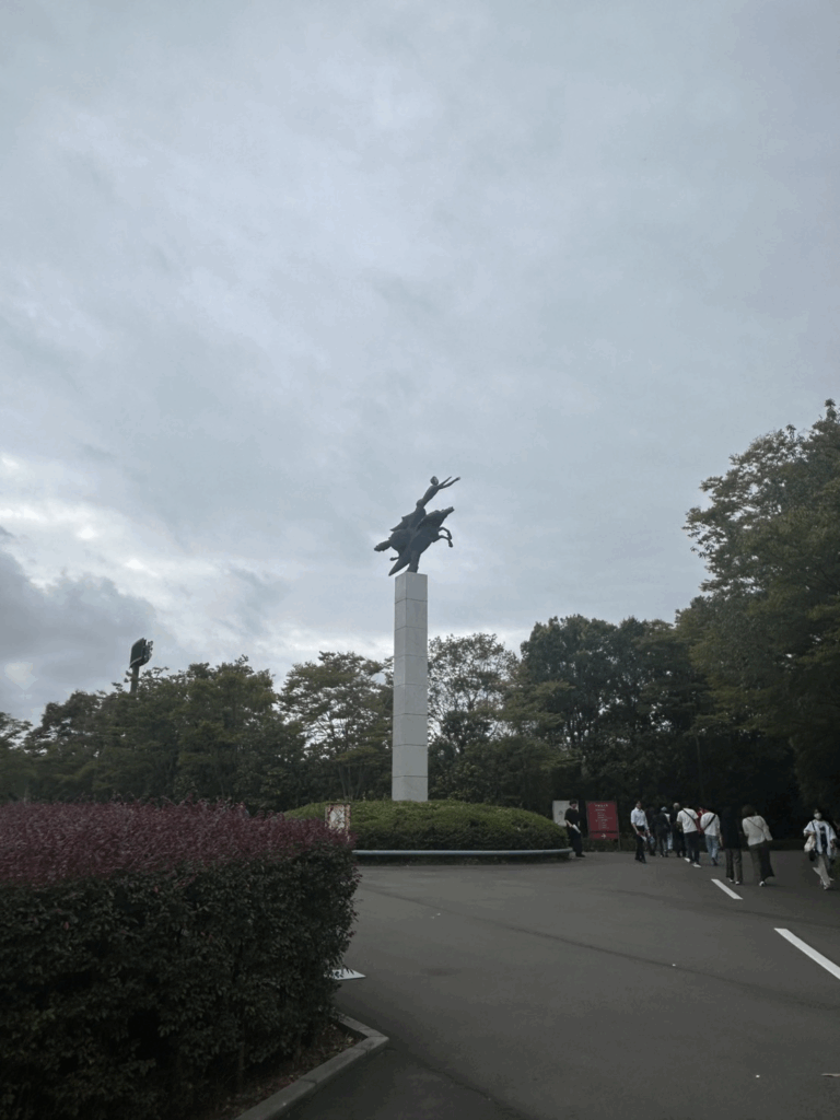 帰宅後注釈:ちなみにこの美しい像、人とペガサスという作品らしいです。曇天すぎて正しい画角がわからず、逆光の撮影者側からみるとゴーヤから幽体離脱している人間にしか見えなかったのが申し訳ないです。違う角度から振り仰ぐと、素敵なペガサスの構図が現れるようです。興味を持った美術を愛する諸賢はぜひ検索してみてくださいね。
