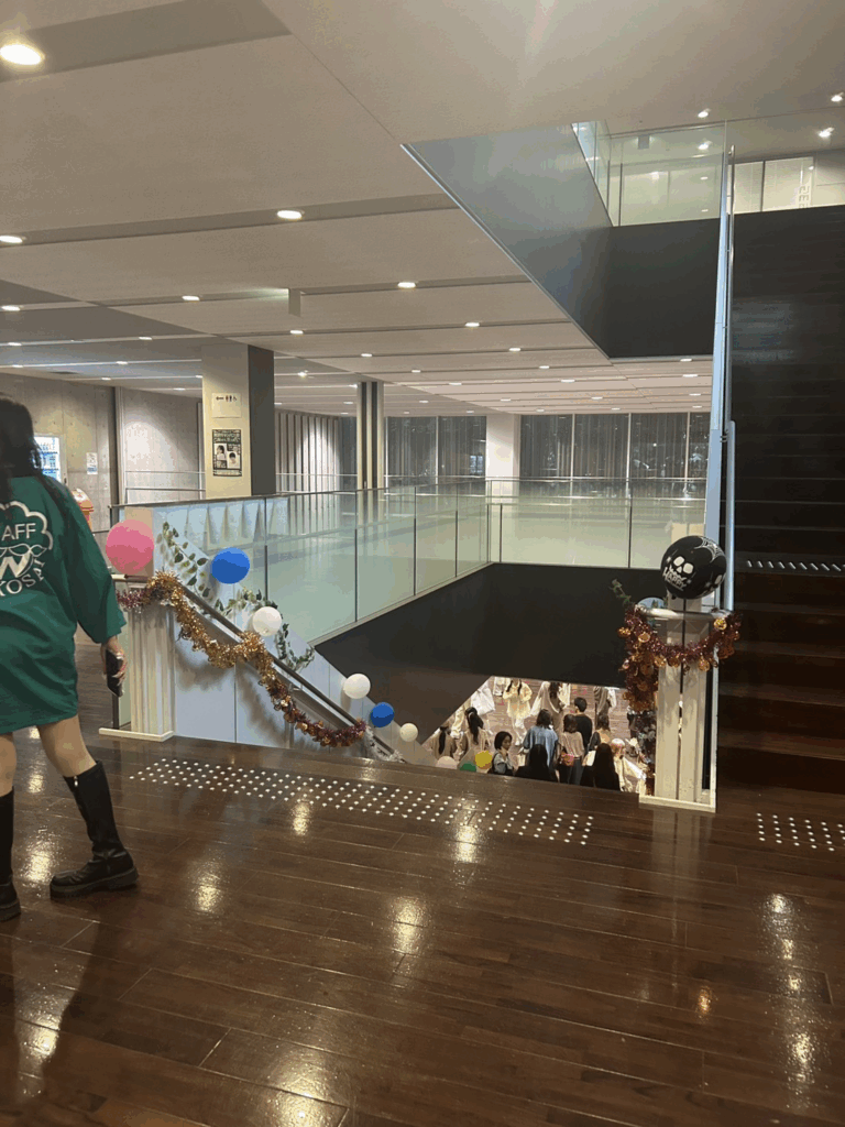 雨が降り出しました。出番が潰れる可能性があるんであるんである(大隈重信)。やはり外に出ることができないので、所沢キャンパスのルームツアーをしていきたいと思います。頭の中で『2:23 AM』を流しながら読んでくださいね。こちらは階段です。ハロウィンらしい飾りがかわいいですね。草ソムリエとしては、やはり葉っぱのガーランドに心惹かれます。